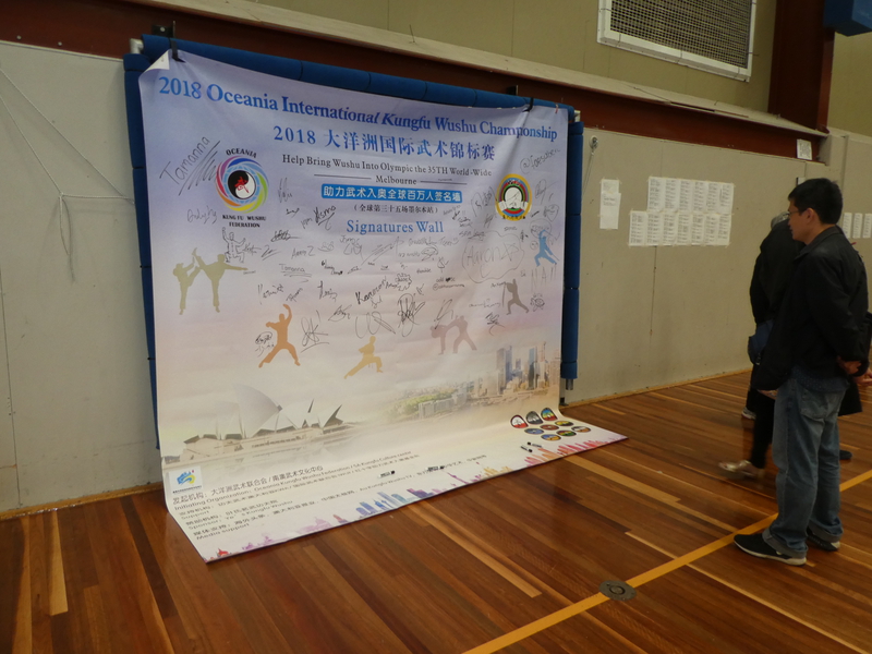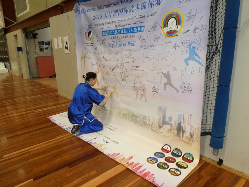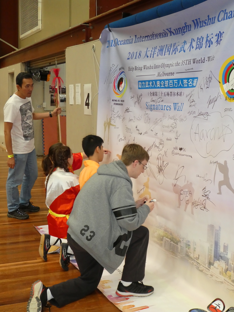 Mr Bingchen Ye, Secretary General of Kung Fu Wushu South Australia, also set up a signature wall, whereby athletes, officials, spectators and other supporters were encouraged to sign a petition in support for getting Kung Fu/Wushu into the Olympics.
